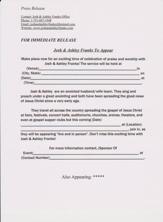 SEND LETTERS TO AREA PASTORS & MUSIC MINISTERS